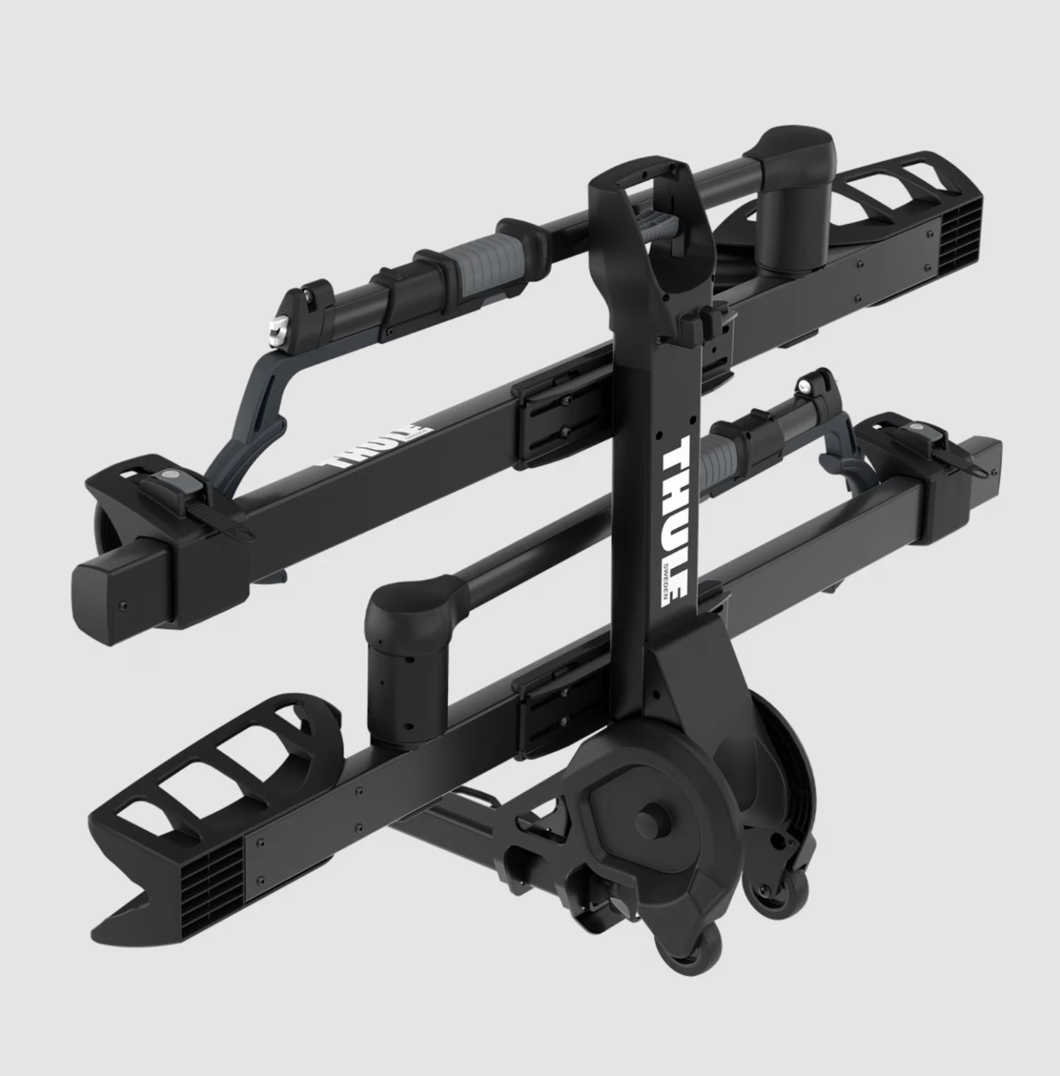 - Integrated wheels help transport the rack to and from the vehicle