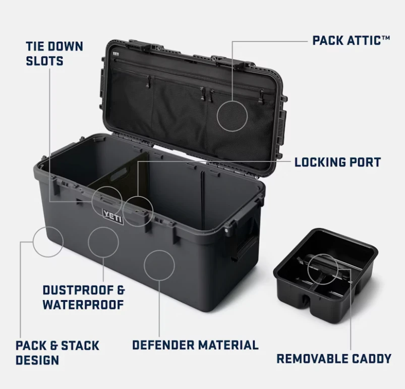 The LoadOut GoBox 60 Gear Case holds everything and the kitchen sink. When there’s gear you can’t afford to be without, this is the personal gear locker you bring. Right at home in the bed of your tuck, it’s the essential companion for extended camping and hunting trips. With reinforced latches and a Wildproof design, it’s built to hold up to years if snow, mud, dust, dog slobber, and saltwater.