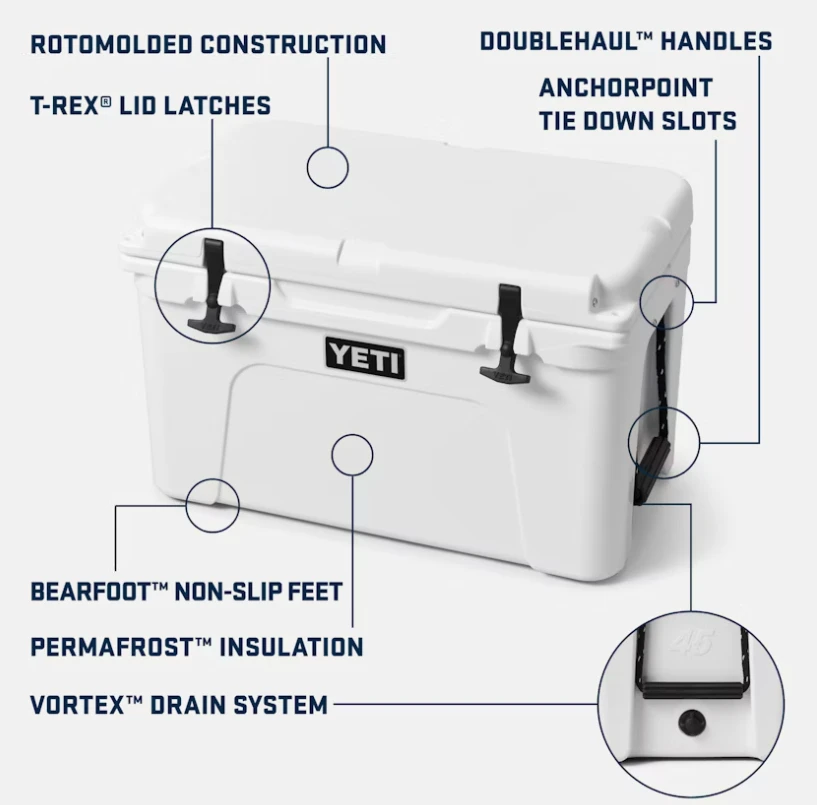 The Tundra 45 Cooler combines versatility with durability. This premium cooler is infused with that legendary Yeti toughness – a durable rotomolded construction – and up to three inches of PermaFrost Insulation. Which is to say it’s built to last and will keep your contents ice-cold even in sweltering conditions, or keep your campfire food wam despite the wind chill.